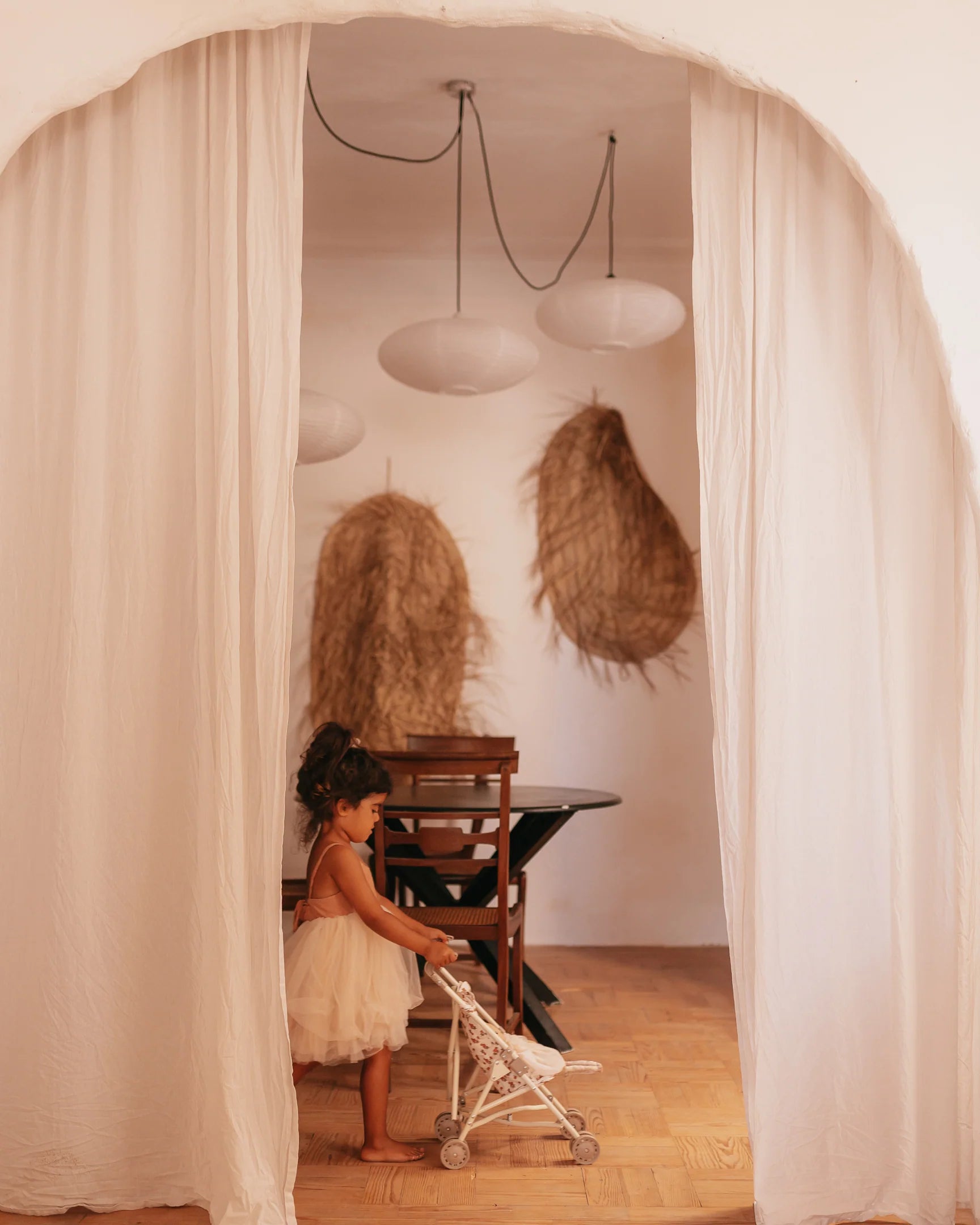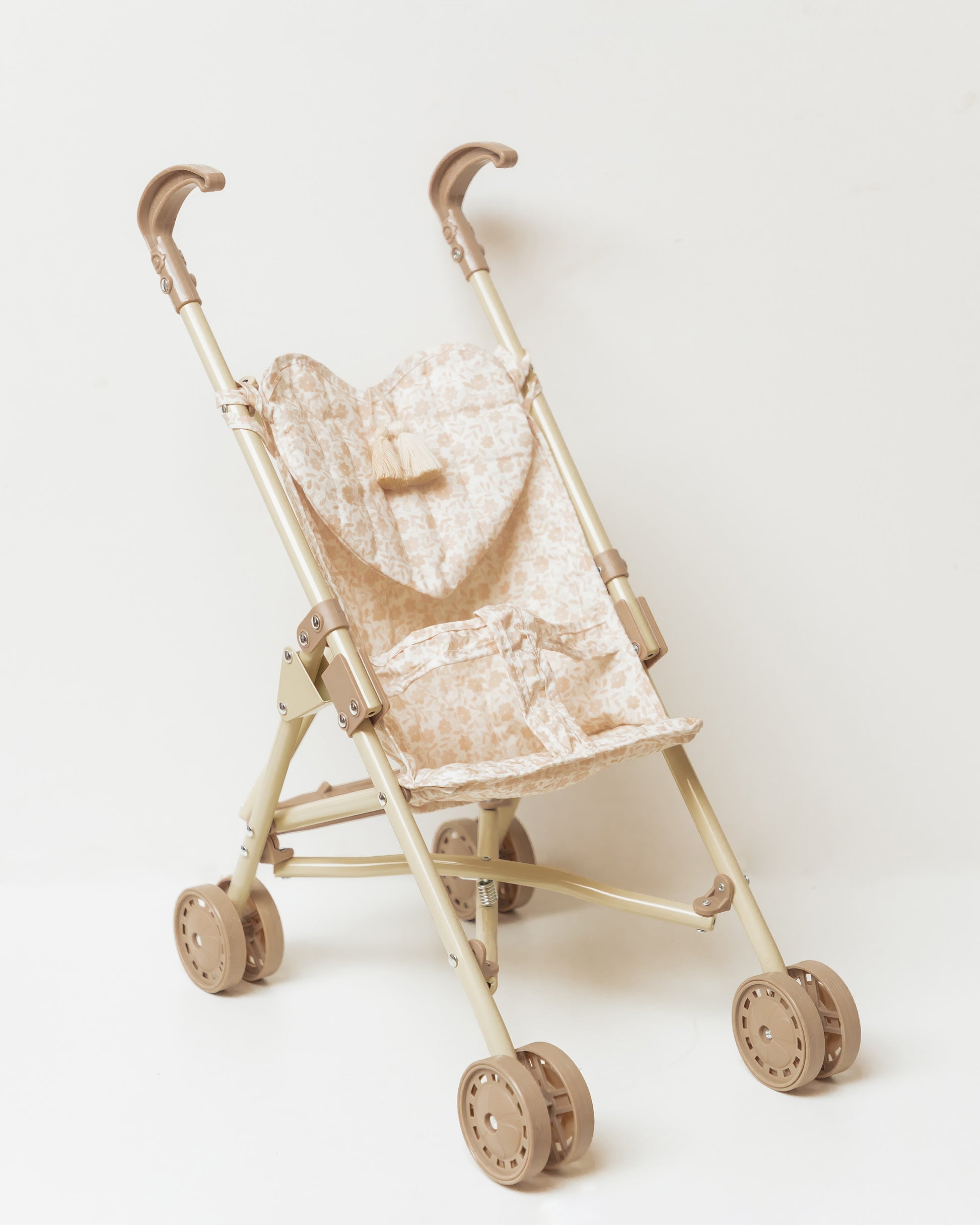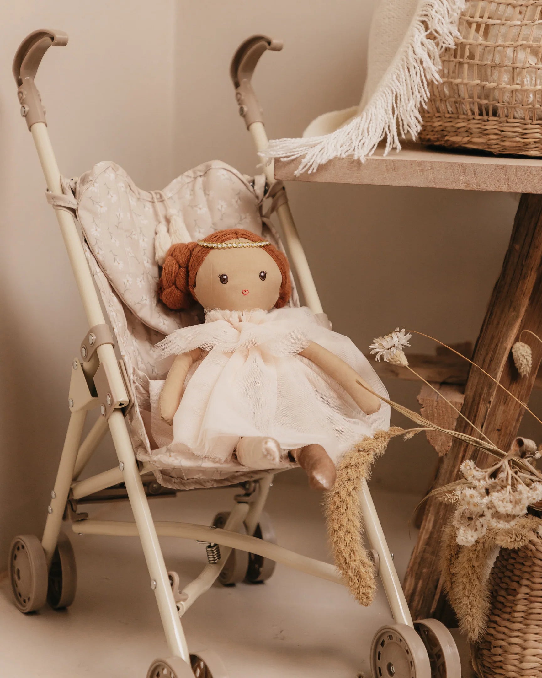 Vežimėliai pagaminti iš organinės medvilnės su nuimama audinių dalimis. Juose yra širdelės formos krepšelis smulkiems aksesuarams laikyti. Vežimėliai turi dvigubus ratukus ir metalinę konstrukciją.